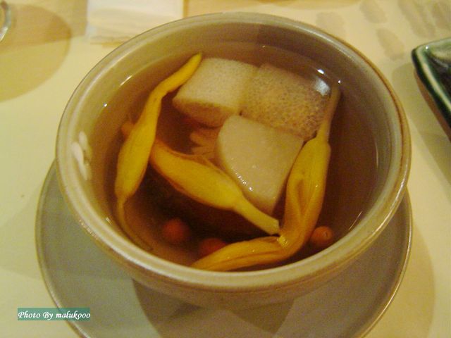 第三道是湯品,金針竹笙鮮菇湯,看似清淡的湯頭,嚐起來卻有濃郁鮮菇的鮮甜,好喝!!