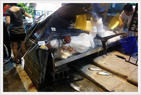 海產店外直接就把一隻鬼頭刀給秀在門外了,真霸氣!