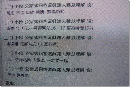 因為小伶問起我的行程,我說後天會去走蘇花,但原本說要陪騎的怪客有突發事件,沒辦法來陪我騎蘇花,我自己一個人也不敢去騎那個路線,小伶便很有心的幫我問他的車友們看要怎麼從花蓮到宜蘭比較方便,還把車次跟時間都跟我說得很清楚,最好笑的是,還叮嚀我一定要裝可憐......哈哈哈