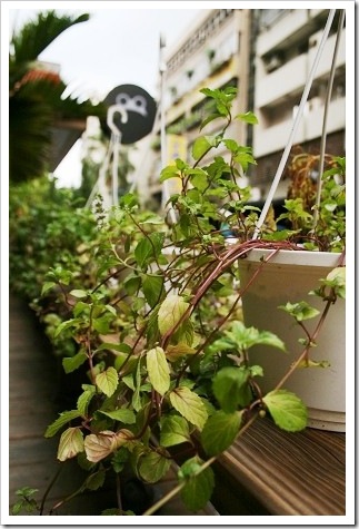 店前有一排綠色小盆栽,近看雜亂無章,遠看又覺得亂中有序,為溫暖的色系中添了一抹綠意,很美。