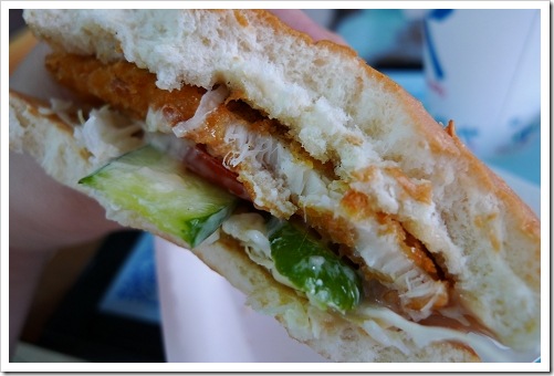 雖然他肯定是那種冷凍魚排,不過吃起來還是有魚的鮮香味,魚排跟裡頭的生菜、番茄、小黃瓜這幾樣清爽的蔬菜搭配著吃起來就感覺很棒很好吃,一點都不油膩!!
