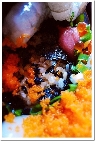 蝦卵的口感也不惶多讓,雖然比較小顆,但在口中大量爆裂的感覺吃起來感覺真爽快,搭配已經淋上醬料的白飯一起吃真是Match到不行,很棒阿!!!!