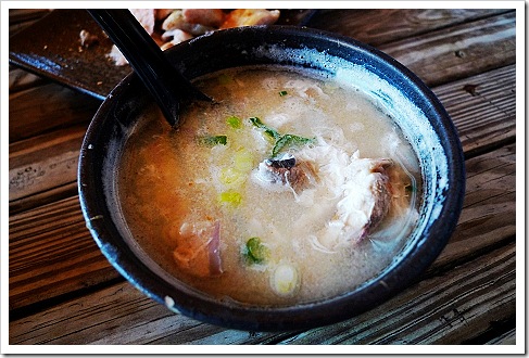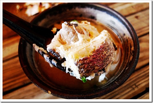 附湯是海鮮魚塊味噌湯,湯底應該有用蝦殼熬,有非常明顯的海鮮味,每一碗湯都毫不吝嗇地盛入了好幾大塊的魚塊,這魚肉口感吃起來稍微硬了點,不過湯的鮮味還不錯,只是我覺得我們來的那天喝到的味噌湯有點偏甜,如果甜味可以再少一點的話,喝起來就更讚囉!!