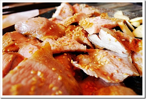 這是烤松阪豬,除了灑上芝麻跟胡椒鹽之外,還附了生切的蒜片可以一起食用。