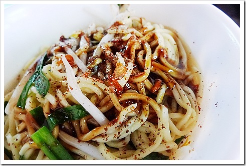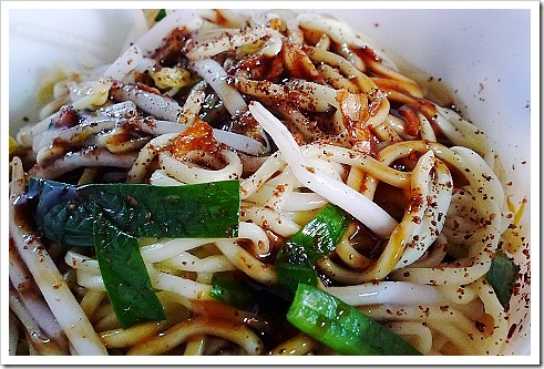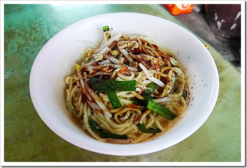 乾麵完全沒有配料,只有韭菜、豆芽,再淋點醬油、豬油蔥就完成了,不過還蠻大碗的!!