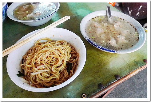 像這樣一組乾麵+扁食湯總共60元,不過也是有大小碗之分啦!!我們點的乾麵跟扁食湯都是小碗的。